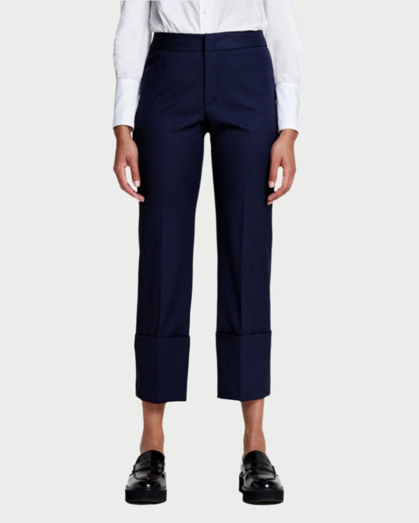 The Smythe Flood Pant, a modern classic with a twist. These tailored mid-rise trousers are cropped to show off the ankle and feature wide cuffed hems for structure and edge. Fitted through the waist and hips, with just enough stretch to move with you.