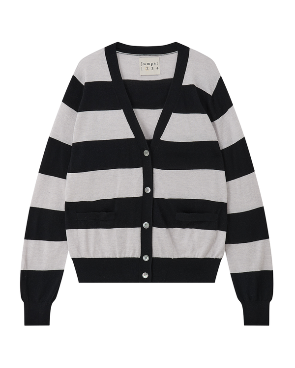The Jumper 1234 Slinky Stripe Cardigan is a timeless essential reimagined with the brand’s signature playfulness. Expertly crafted from a lightweight, "slinky" knit, this V-neck cardigan features a bold horizontal stripe pattern in classic black and grey.