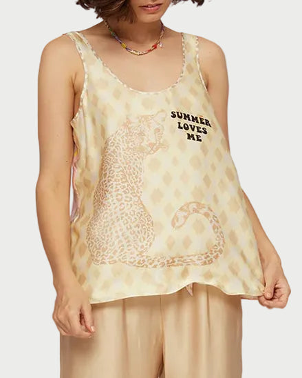 The Me369 Vida Tank Vacation Top is a light, breezy statement piece designed for warm days and carefree moods. Crafted from airy viscose, this mix-print tank features a bold tiger graphic on the front and a playful “VACATION” slogan across the back — because WEST believes your clothes should match your mindset.