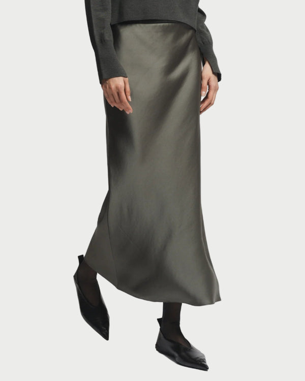 Style Notes: A satin charmeuse skirt with fluid drape and versatile styling — refined yet effortless, in signature Saint Art style.
