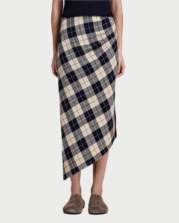 A tailored midi skirt with movement. Cut on the bias for a clean, flattering drape, the Smythe asymmetrical plaid skirt hugs the waist and hips, with soft tucks that accentuate the silhouette. Subtly offbeat, totally chic.